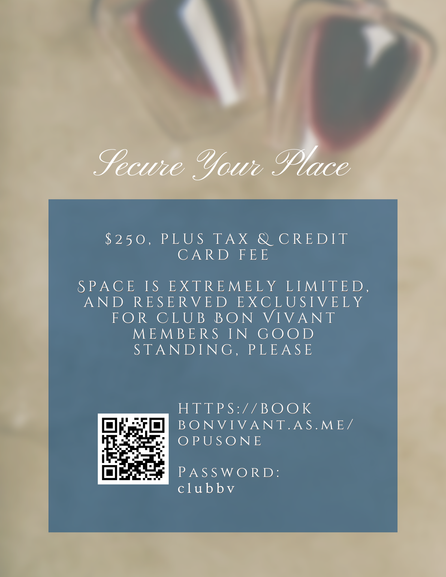 Space is extremely limited, and reserved exclusively for Club Bon Vivant Members in good standing, please.