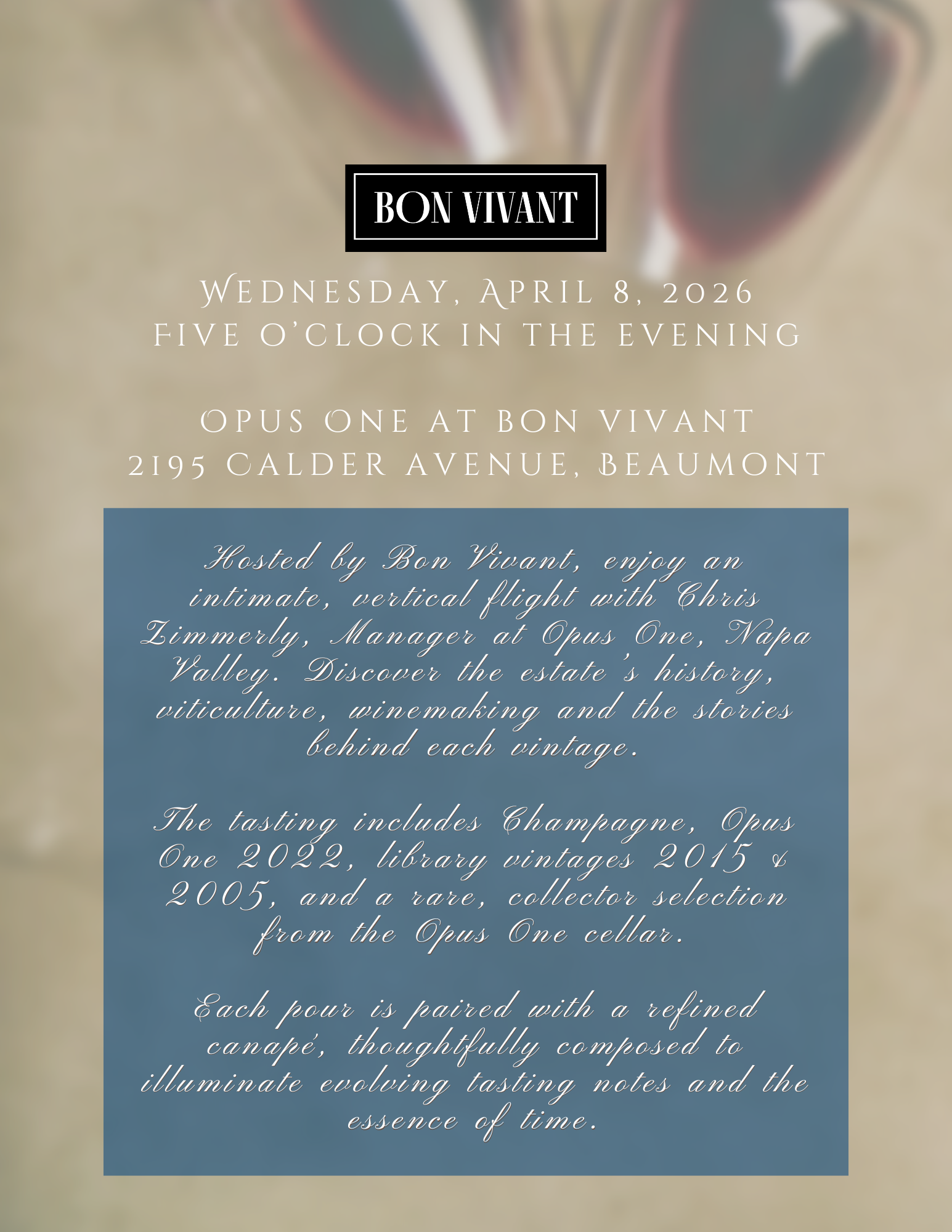 Hosted by Bon Vivant, enjoy an intimate vertical tasting with Chris Zimmerly, Manager at Opus One, Napa Valley. Discover the estate’s history, viticulture, and winemaking philosophy, along with the stories behind each vintage.